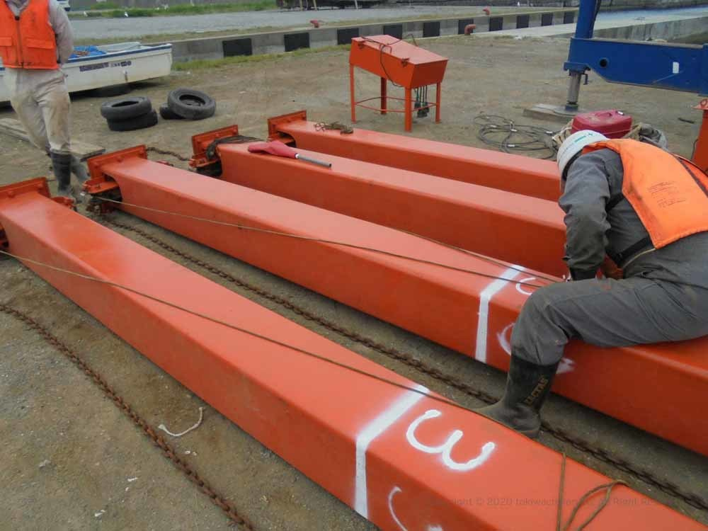 台船着水(組み上げた台船を大型クレーンにて着水)